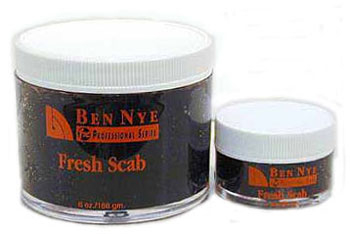 Ben Nye Fresh Scab realistically simulates aged, dried blood clots. Top layer “sets” to touch. Remove with Hydra Cleanse or soap and water. Corn syrup content. May stain some fabrics; test before use.