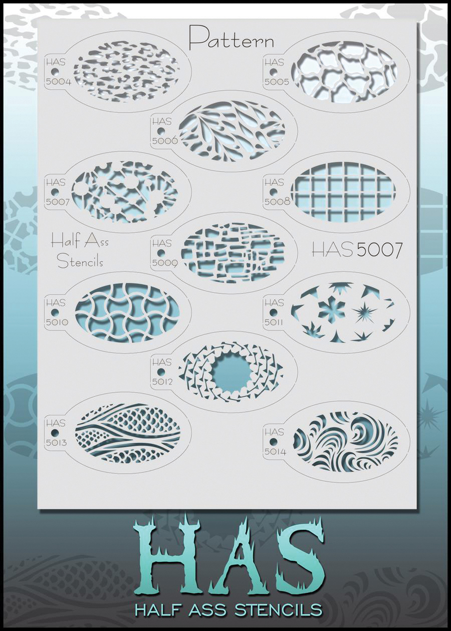 Intricately designed by award-winning makeup artist and body painter Andrea O’Donnell, each individual sheet consists of a combination of thematically related design elements, patterns, textures, etc., that are ideal for use with Graftobian F/X Aire airbrush makeup, Graftobian ProPaint, and Graftobian Disguise Stix. See our stencil sponge daubers.