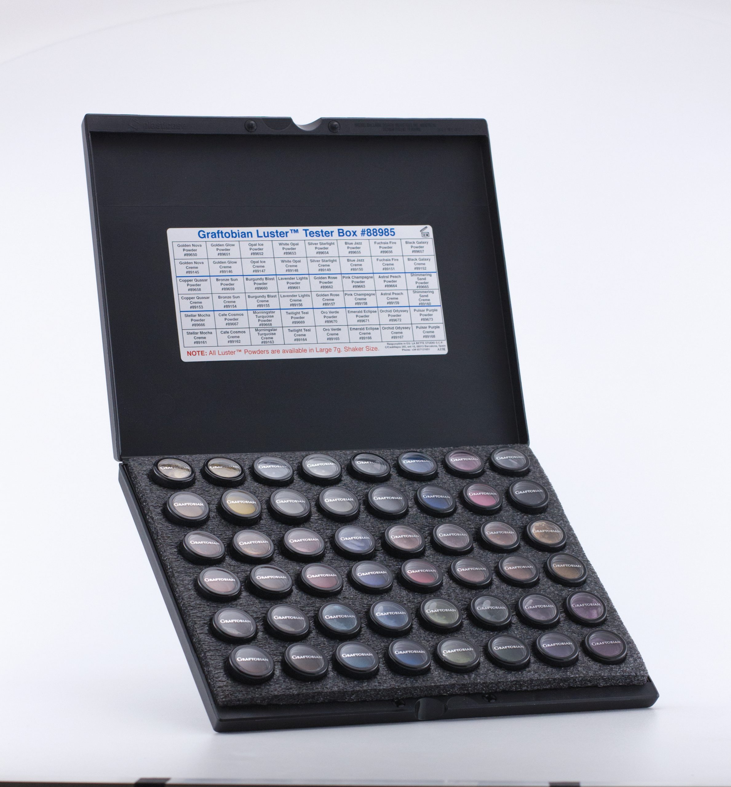 Refillable box holds all 24 Mini LusterTM Cremes and matching 24 Mini LusterTM Shimmer Powders—A professional presentation and stunning array of color. 13”x10”x1.25” laptop−style snap case.