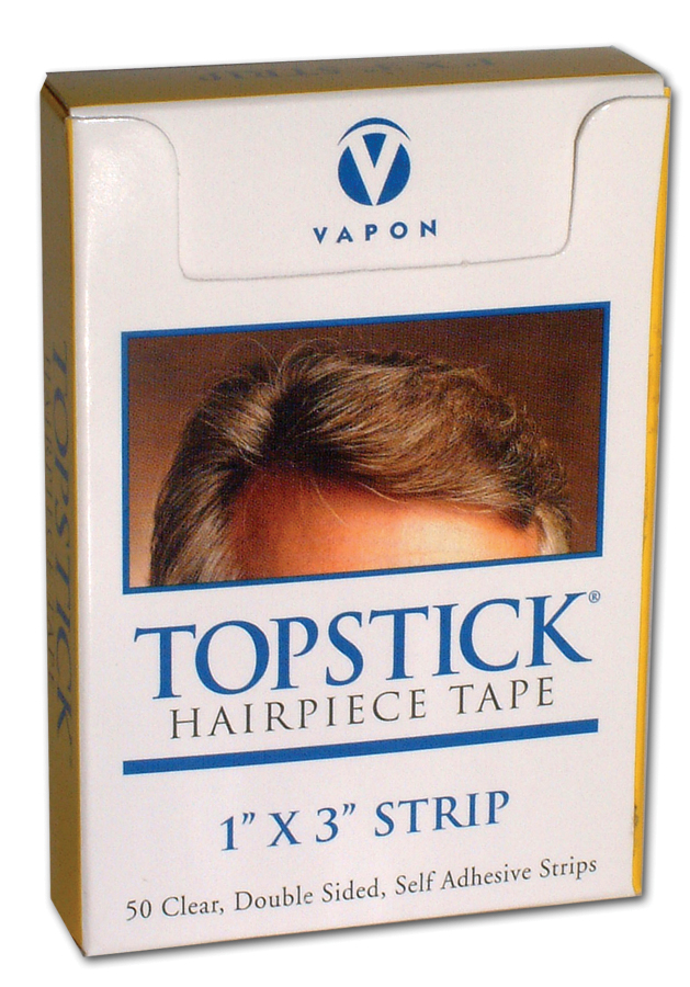 Topstick is a clear, double-sided medical adhesive tape in strips, used, among other things, to hold hairpieces to the scalp.
