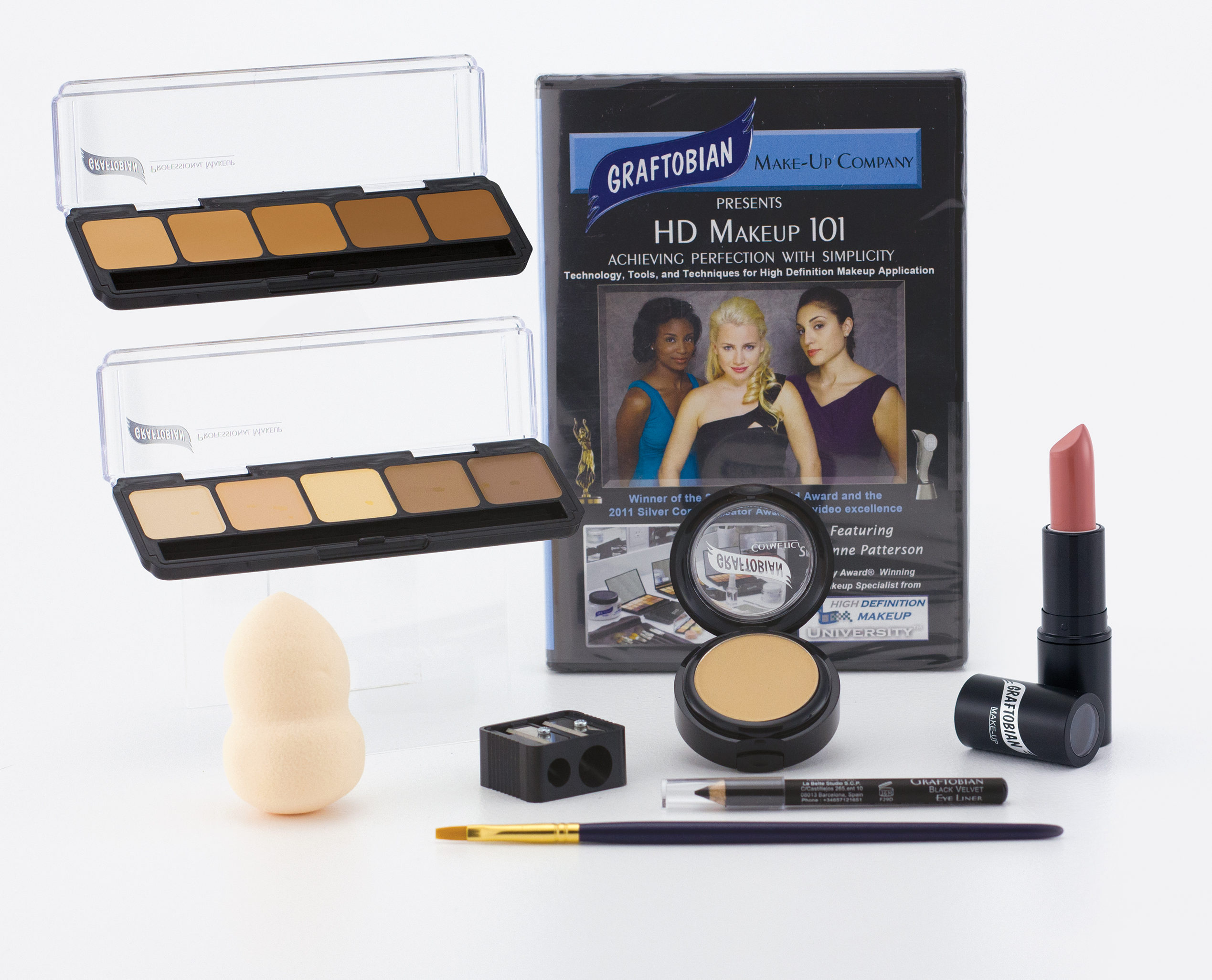 An 11-piece kit, featuring some of Graftobian’s best- selling and essential HD makeup items for personal use, and an introduction to HD Makeup. This HD Makeup Essentials Starter Kit lets you explore the high pigmentation and durability of Graftobian Makeup. Graftobian put together seven kits to choose from, allowing the artist to pick the right kit suitable for personal use, based on undertones: Neutral, Warm, and Cool. Each kit contains one 5-well HD Foundation Palette, a Contouring Palette, HD Pro Powder Foundation, powder puff, GlamourGrip, Pro Pencil in Black Velvet, pencil sharpener, Lipstick in Plum Wine, a #4 at brush, a reusable vinyl bag, and an instructional DVD.